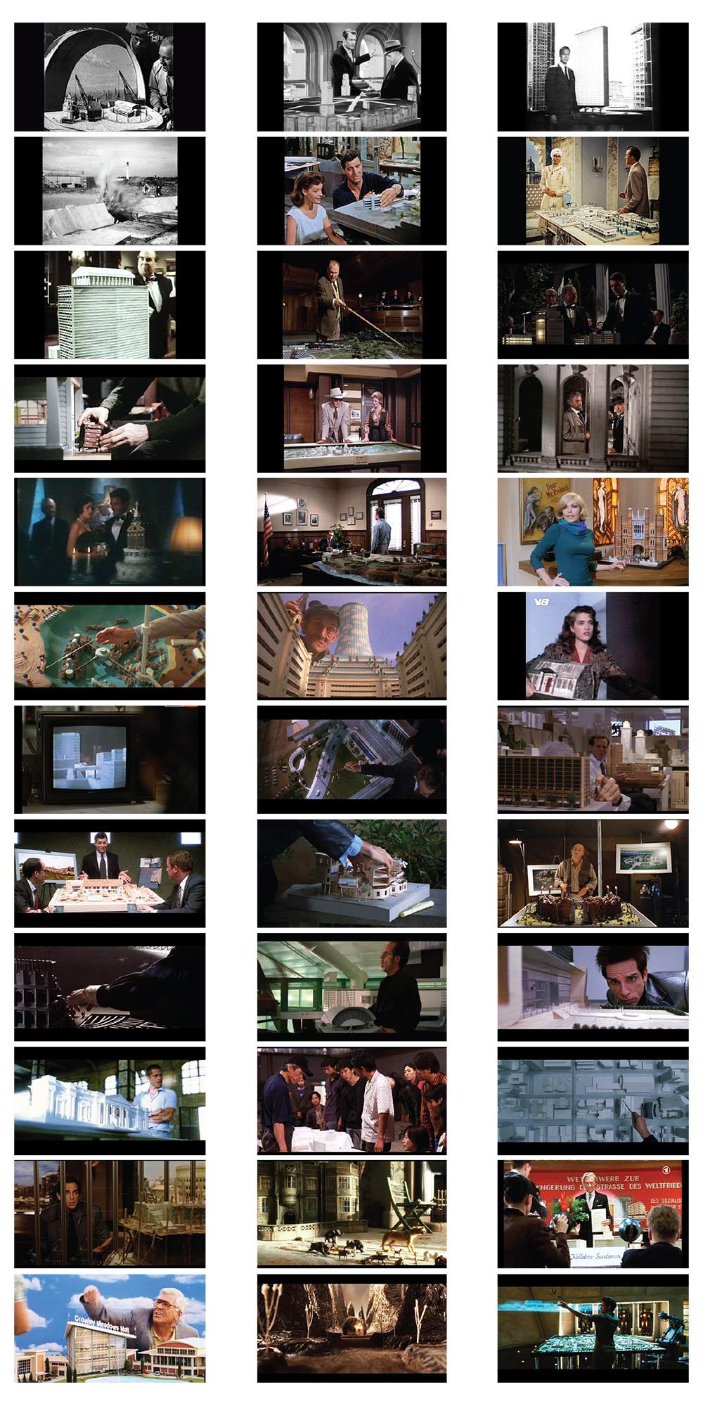 Although Mock-ups in Close-up contains some obvious classics such as The Fountainhead or The Belly of an Architect, it does not primarily quote from “films about architecture”. Rather, it offers a section through a feature film history that is not picky (though with a bias towards a cinema that the two of us are most familiar with, i.e. Western popular cinema). This history, our video intimates, seems to be obsessed with showing models in a variety of contexts. Be it on the fringes or at the center of a scene, architectural models pop up in urban planning conferences or military briefings, during heist preparations or in/as haunted houses, in love stories, thrillers, dramas, comedies or Science Fiction. The films compiled include arthouse and blockbuster fare, auteur cinema as well as instalments of film franchises such as the James Bond, Robocop or X-Men cycles. The list of filmmakers who couldn ́t resist to either pan over or focus on architectural models includes Fritz Lang, Stanley Kubrick, Kathryn Bigelow, Steven Spielberg and (the two directors most frequently showing models) Tim Burton and Alain Resnais.