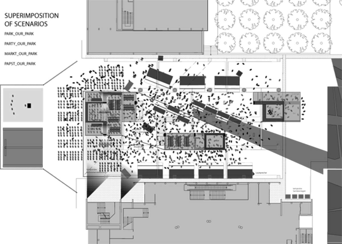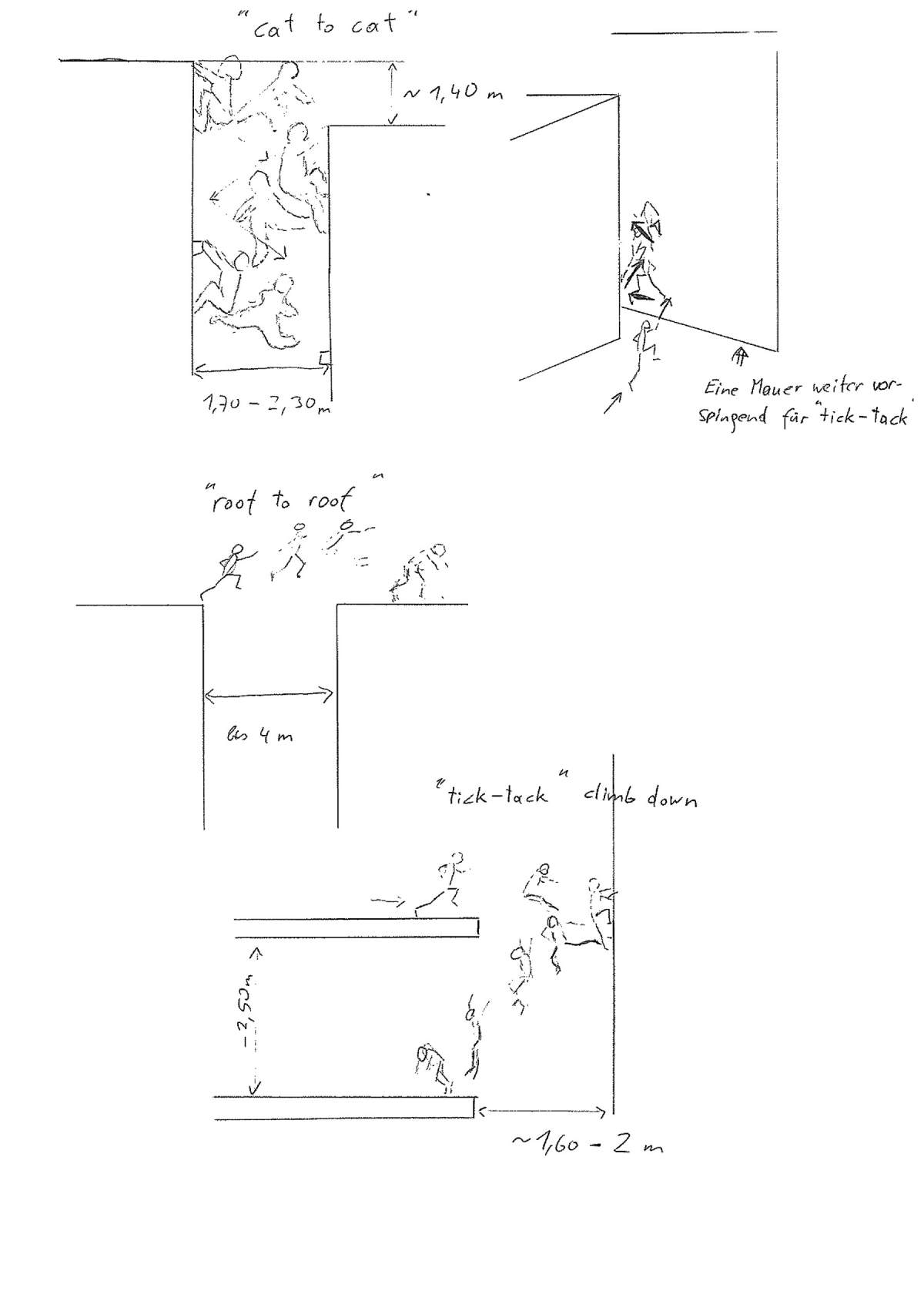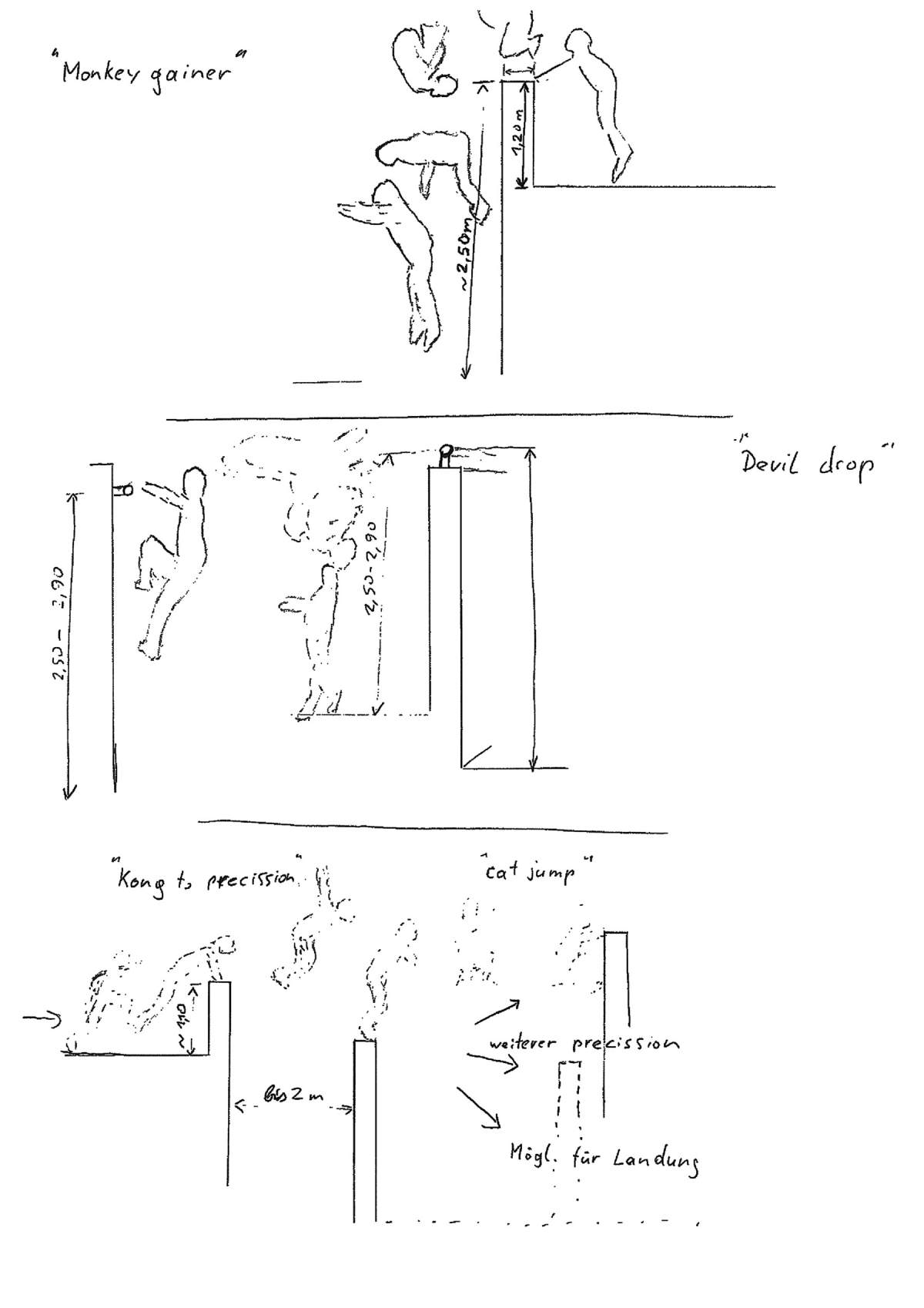 Als eine Praxis, eine Art, sich zur Stadt zu verhalten, macht Parkour das Umfunktionieren, das Umnutzen, zur Sache von Blitzschnelligkeit und zugleich von Routine: Wo spielen nicht erlaubt ist, wird gesportet, was für die einen ein Dach ist, ist für Traceure Landezone oder Absprungsfläche, und das geht im Flug oder zumindest im Sprung. Parkour hinterfragt dabei die Spielregeln der Stadt, unterläuft die Gesetze der Schwerkraft und gestaltet funktionale Bewegungsräume der Stadt zu Trainings- und Spielräumen um. Was der Architekturtheoretiker und Urbanist Iain Borden über Skateboarding schreibt, lässt sich auch für Parkour denken; geht es denn auch um „use values rather than exchange values, activitiy rather than passivity, performing rather than recording, potential components of the future, as yet unknown city“.