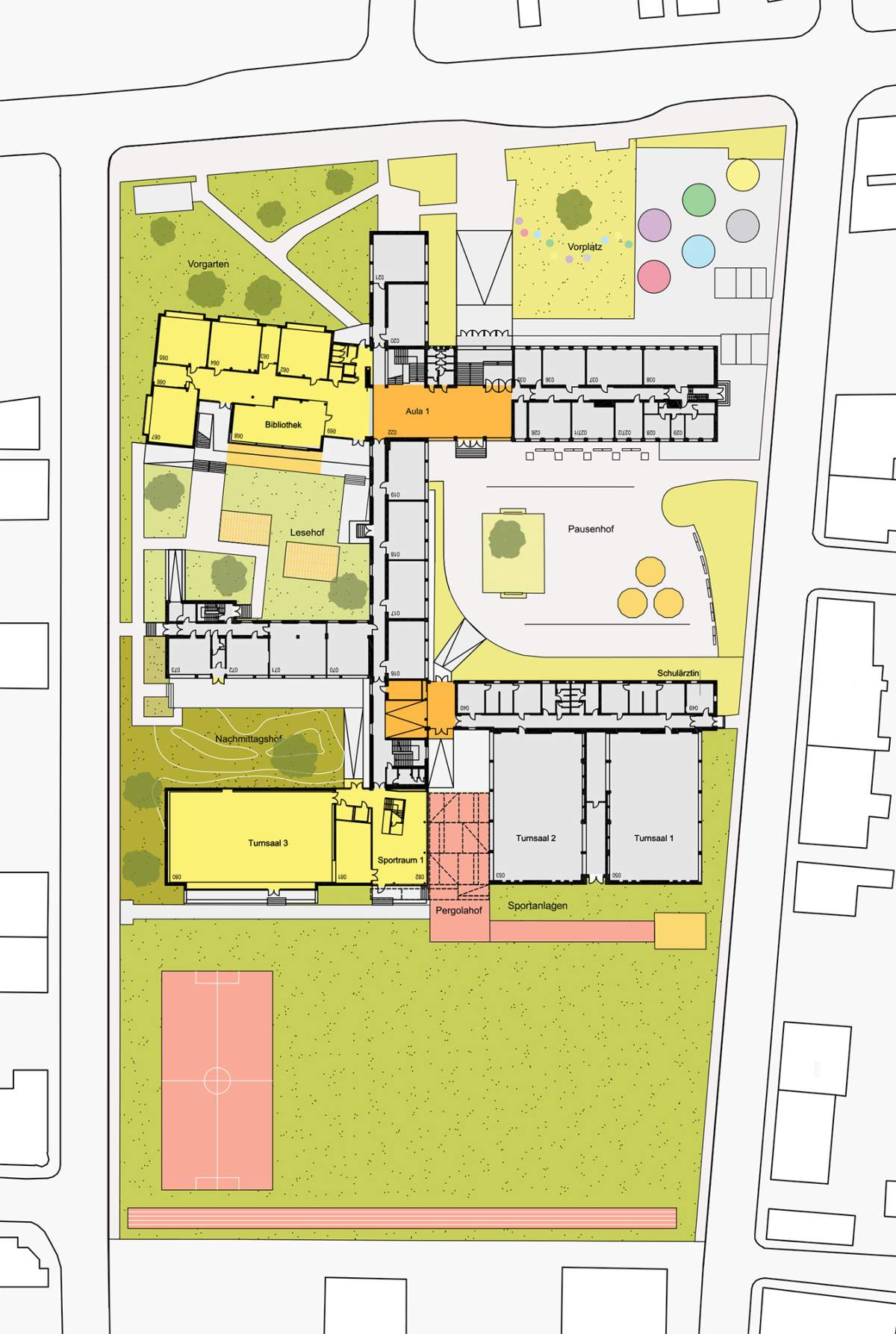 The existing school was built 1962-64 by Theiss & Jaksch. The new additions continue its logic of courtyards by adding three more: Next to the new classrooms: the “reading court”, an afternoon court and a pergola sports courtyard. The slight twist of the new classroom building irritates the linear corridors in the inside on purpose, creating different viewing angles, on the same time strengthening the quality of the central aula of the existing part.
