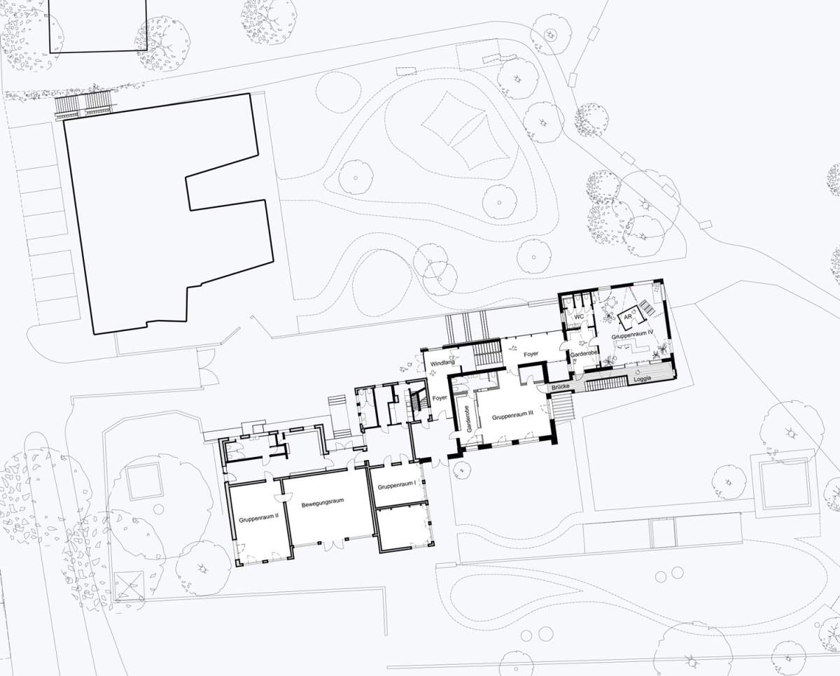The new kindergarten group was added to the existing chain of kindergarten houses to the east and is connected to three existing groups internally via a new connecting wing. This is also the access wing, staircase and garden pavilion. A new infant day care center was developed in the previously lightly used adjoining rooms of the existing building.