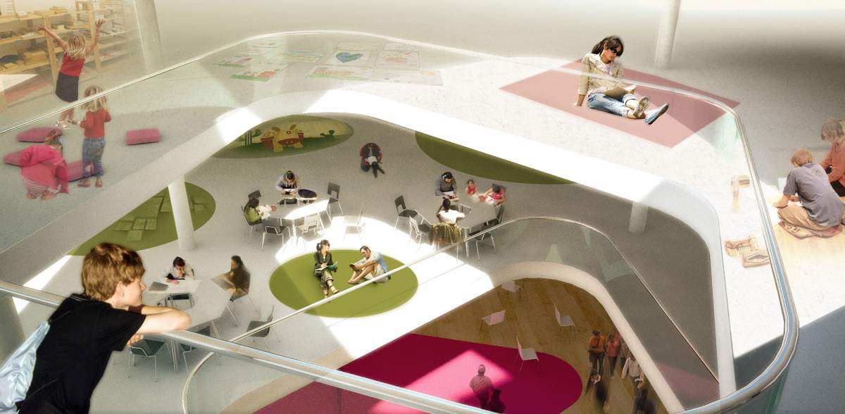 The entire free zone of the first and second floor is a library, which means that there is not a library in the school anymore, but the school in the library: learning takes place in one large library, partly closed or completely open.