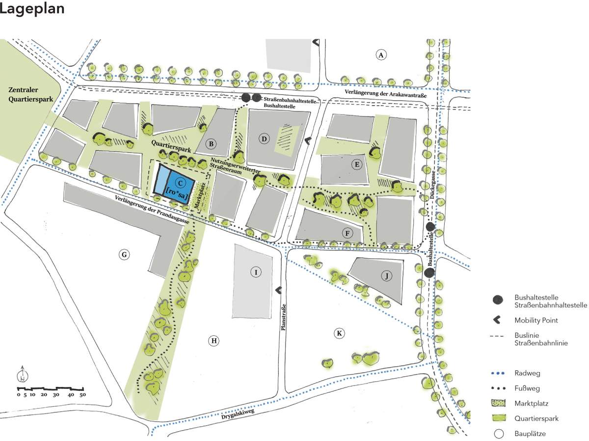 The urban plaza with seating areas, the play area in the west and the community terrace are characterized by a solid and robust green design with trees, grasses and perennials. The building greenery makes the house a green center in the neighborhood. The house blooms by itself ([ro*sa]) and even more by the gardening of the residents* of the building group and the neighborhood ([ro*sa]).