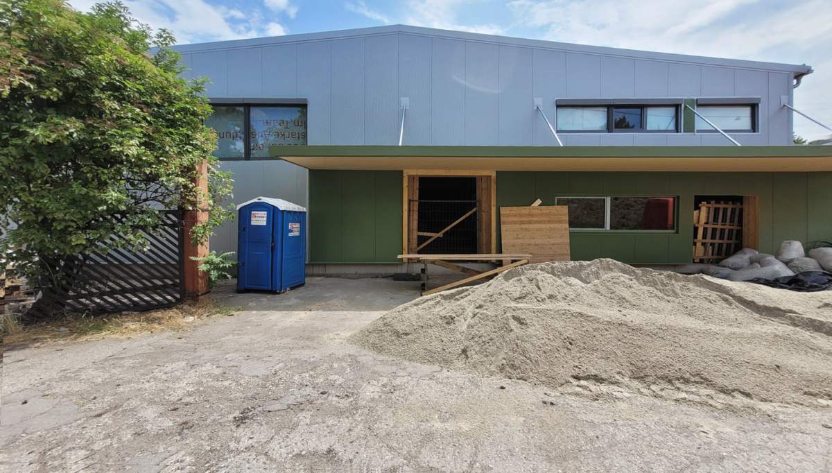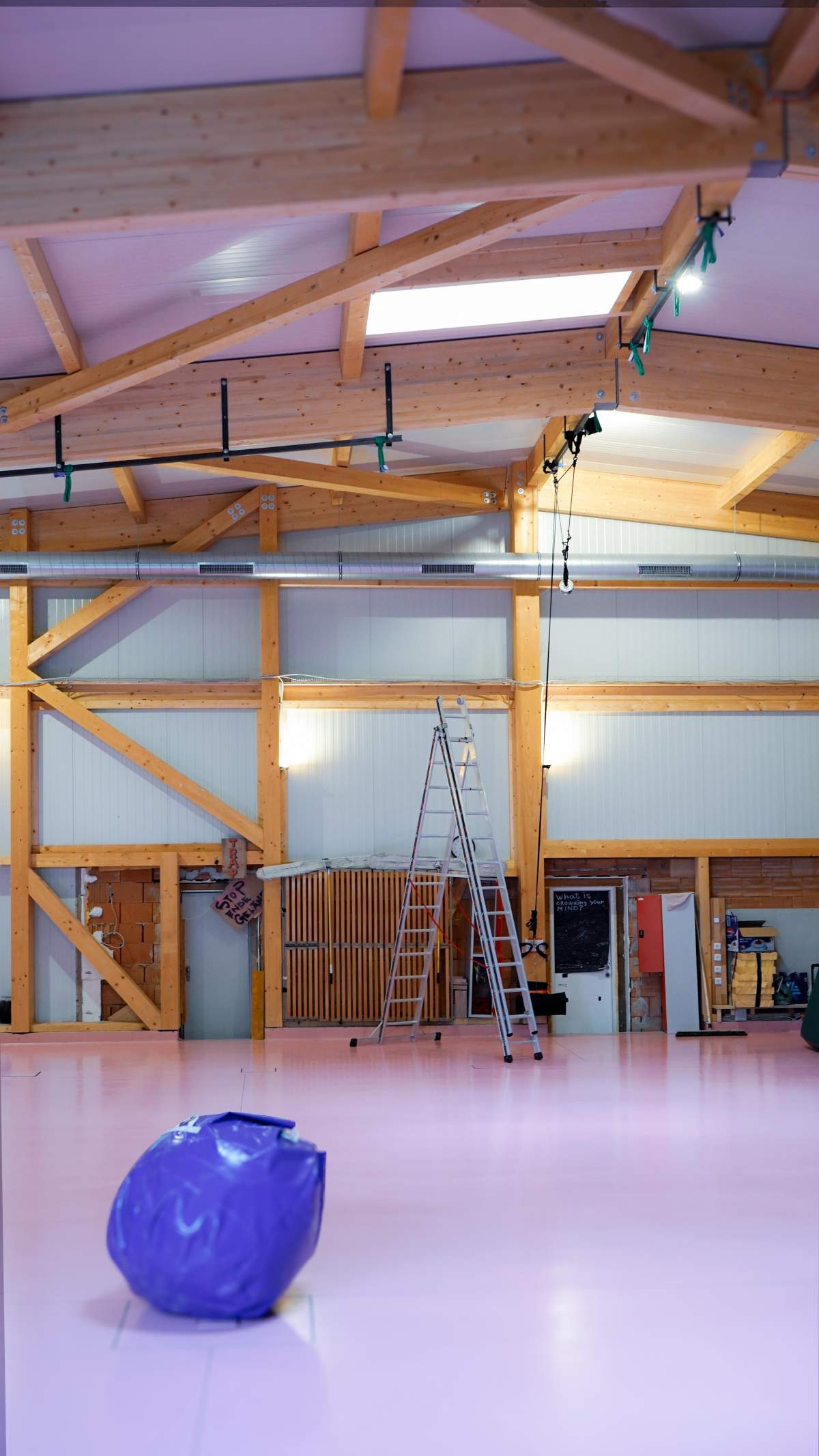 The original hall could not be kept as it was: a lack of insulation and a static construction that could hardly bear any loads prompted the group to build a wooden hall on the existing foundation, while retaining the floor structure and the shell cubature. This was designed specifically for the needs of the Viennese aerial acrobatics scene and has numerous suspension points on the ceiling. The old hall shell was dismantled in pieces and individual material parts and could be newly erected in Lower Austria.