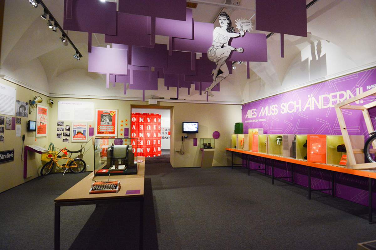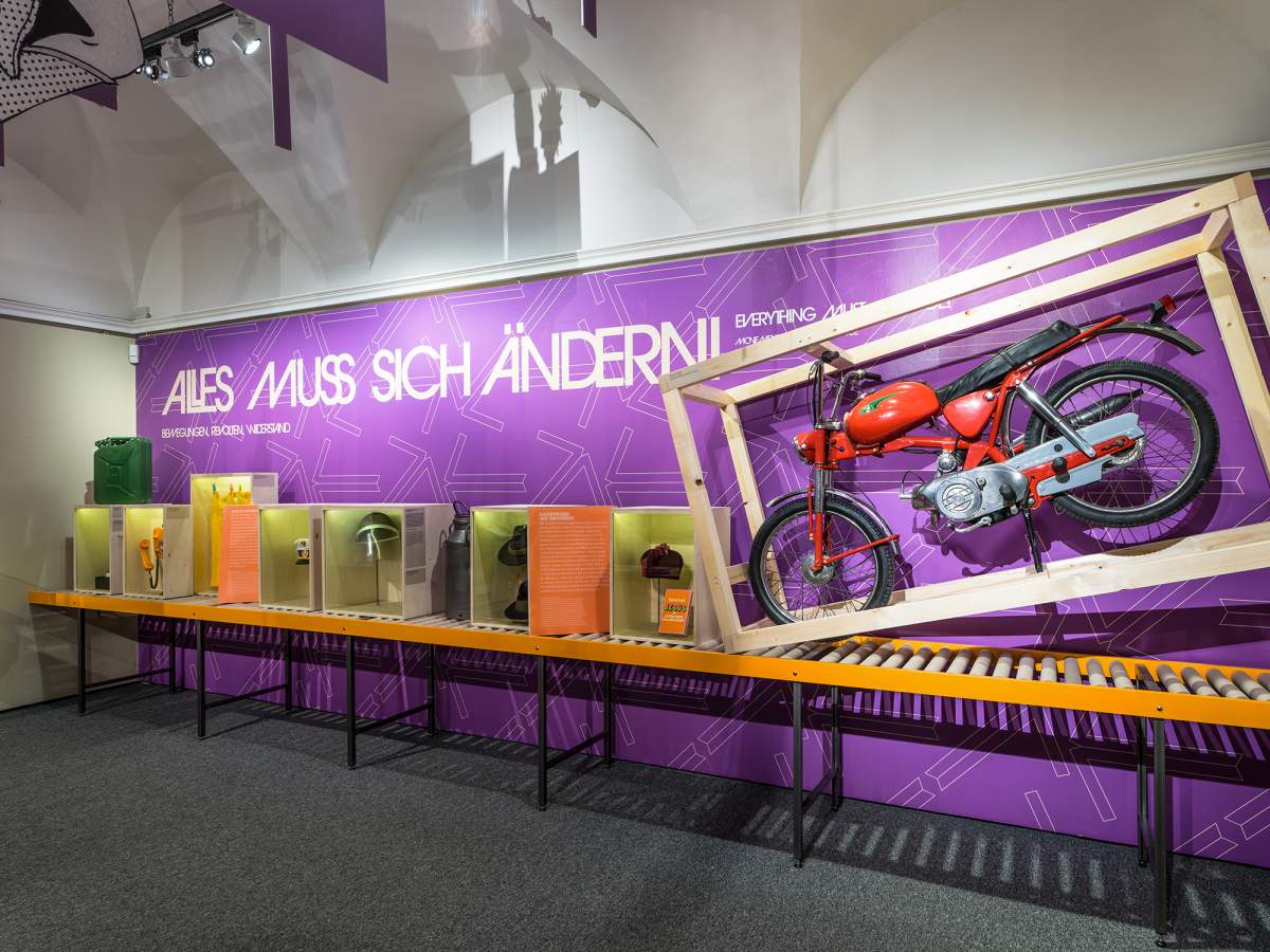 Chapter of the exhibition: Work and education for everyone! Promises and breaks in the welfare state Everything must change! Movements, revolts, resistance It’s showtime! Daily life and the media Austria, island of bliss. Of cold and hot wars Break what breaks you! Contested pasts and Nazi continuities The personal is political, the political is personal! Alternative living *Museum for everyone! Exhibition utopias and the Museum of the Future