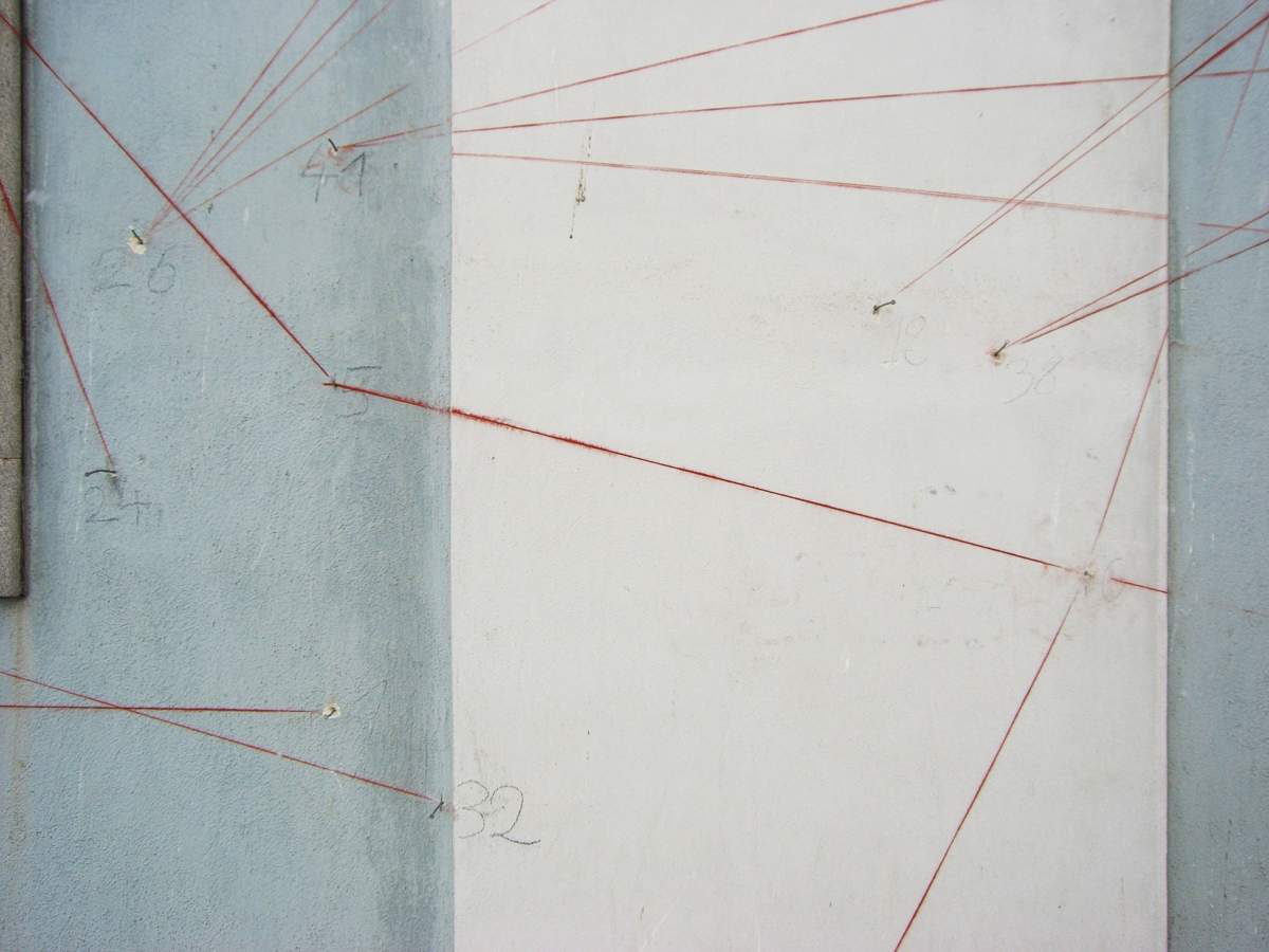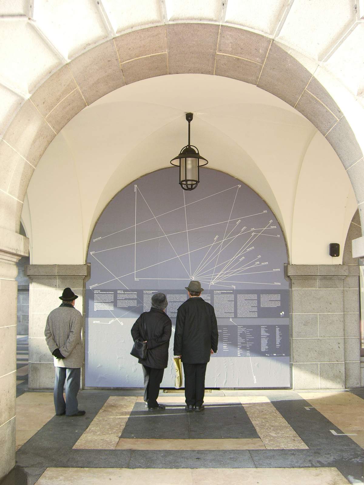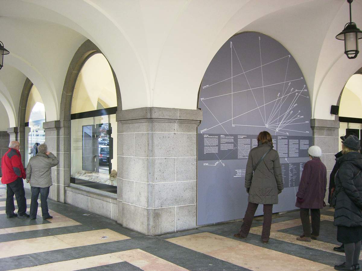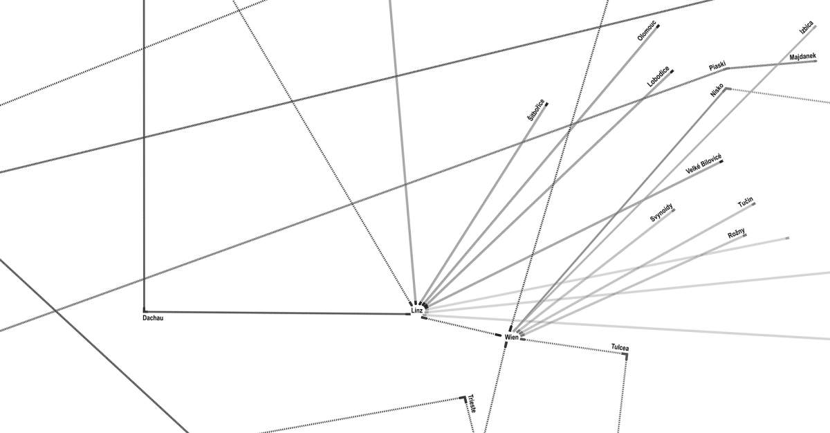 Der Bau confronts the building and its surroundings as they appear today with archival documentation, material evidence, and eyewitness interviews. Its stories are told in five video displays by Hito Steyerl, mounted in the building’s commercial space. A pattern chiseled into the building´s façade – directed by the architect Gabu Heindl – shows the trajectories of the stories´ protagonists across the world, removing the plaster to reveal a symbolic map of forced labor, displacement, and annihilation.
