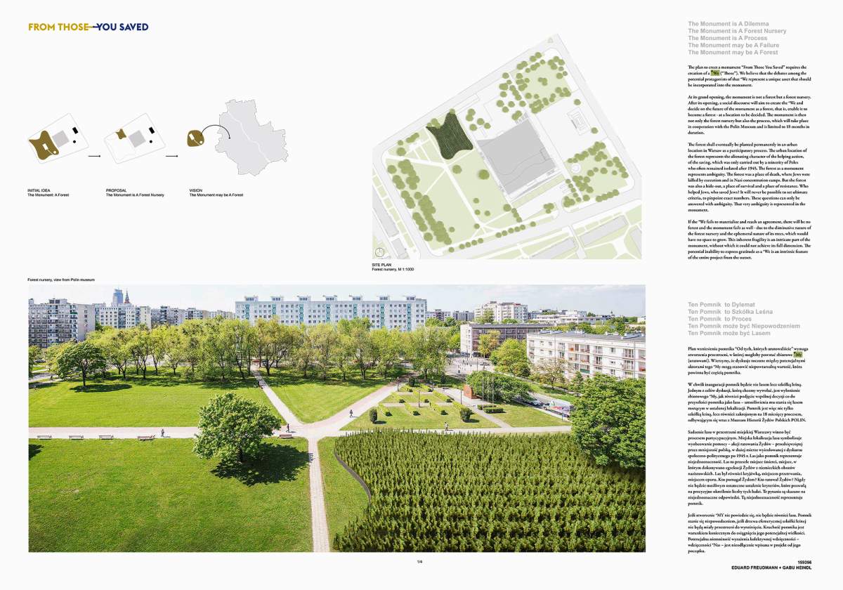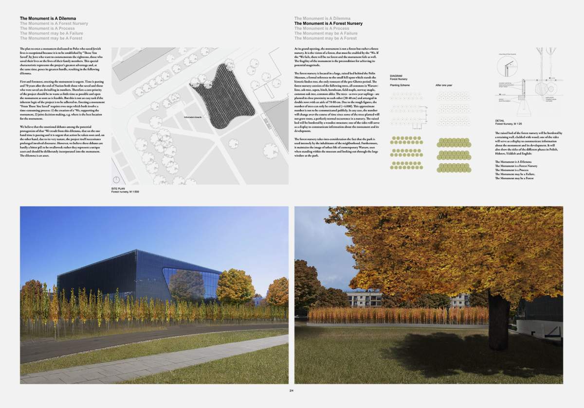 The forest shall be planted permanently in a participatory process. The urban location of the forest is key. It stands for the alienating character of the helping action, of the saving, which was only carried out by a minority of Poles who, in many cases, remained isolated after the end of the German occupation due to Polish anti-Semitism. The main motive behind planting a forest in a city to be a monument is the ambiguity represented by the forest.