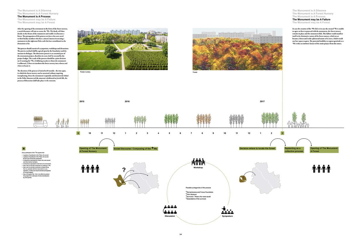 After the opening of the monument as a forest nursery, a social discourse will aim to create the *We and decide on the future of the monument as a forest, that is, enable it to become a forest – at an urban location in Warsaw to be decided. The monument is not only the forest nursery or the forest but also the process, which will take place in cooperation with the Polin Museum and is limited in duration. The inherent fragility of the nursery is an intricate part of the monument, without which it could not achieve its full dimension.