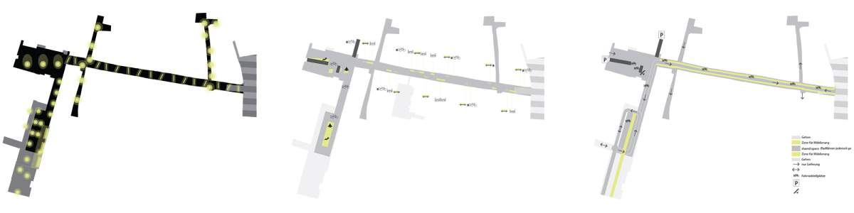 What is striking about Herzog-Leopold Straße is its liveliness. Within the narrow street space there are a variety of entrance situations and a range of activities take place. The new flooring pattern structures the collective and diverse use. Areas of movement are distinguished from quiet, consumption-free recreational areas by changes in the flooring. The street is designed to be barrier-free, the elements, whether public or private, can be dismantled.