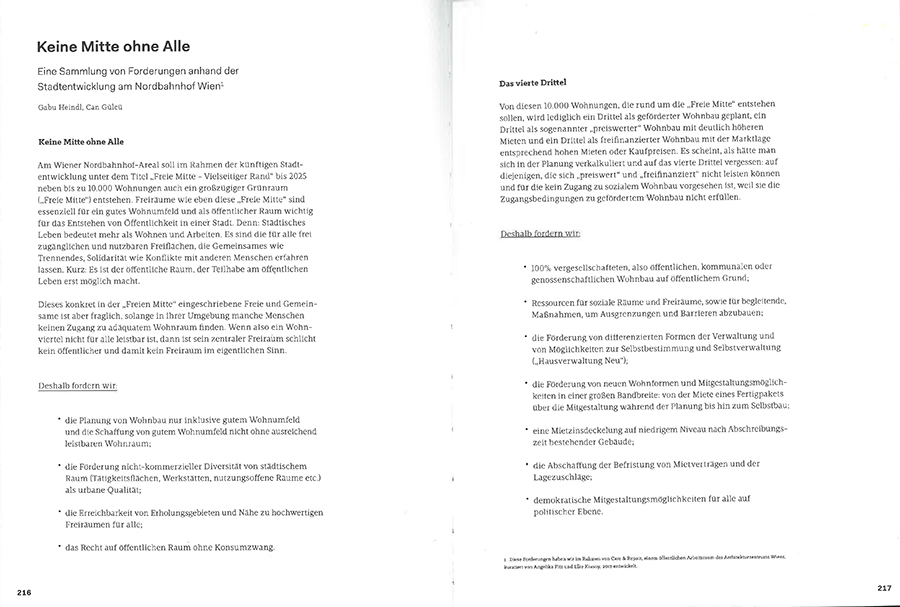 ,Keine Mitte ohne Alle‘, Gabu Heindl mit Can Gülcü, in: Der Abgestellte Bahnhof. Das Wiener Nordbahnhofgelände und die Freiheit des Raumes, Falter Verlag, 2018