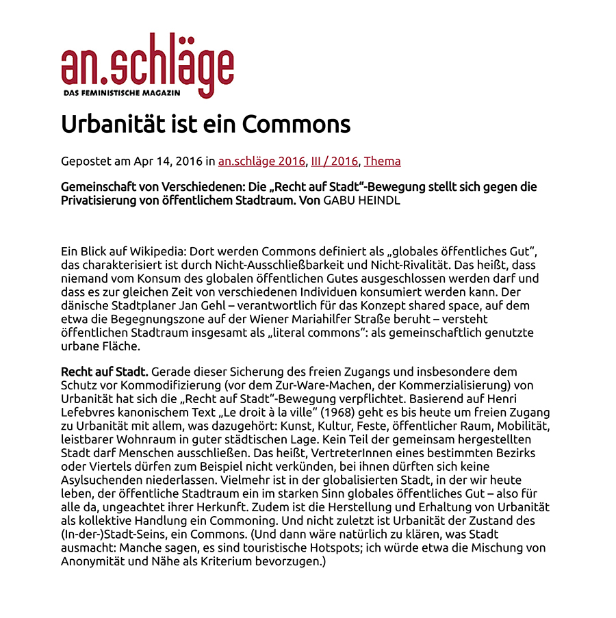 Link zum Online Artikel: https://www.anschlaege.at/feminismus/2016/04/urbanitaet-ist-ein-commons/