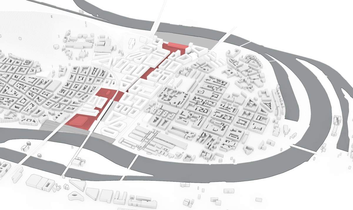 Invited by the government of Praha 7 we conceptualize the structure for a city of common spaces for 27.000 new inhabitants and 10.000 people working there by means of a maximum share of public space in a maximally dense city,